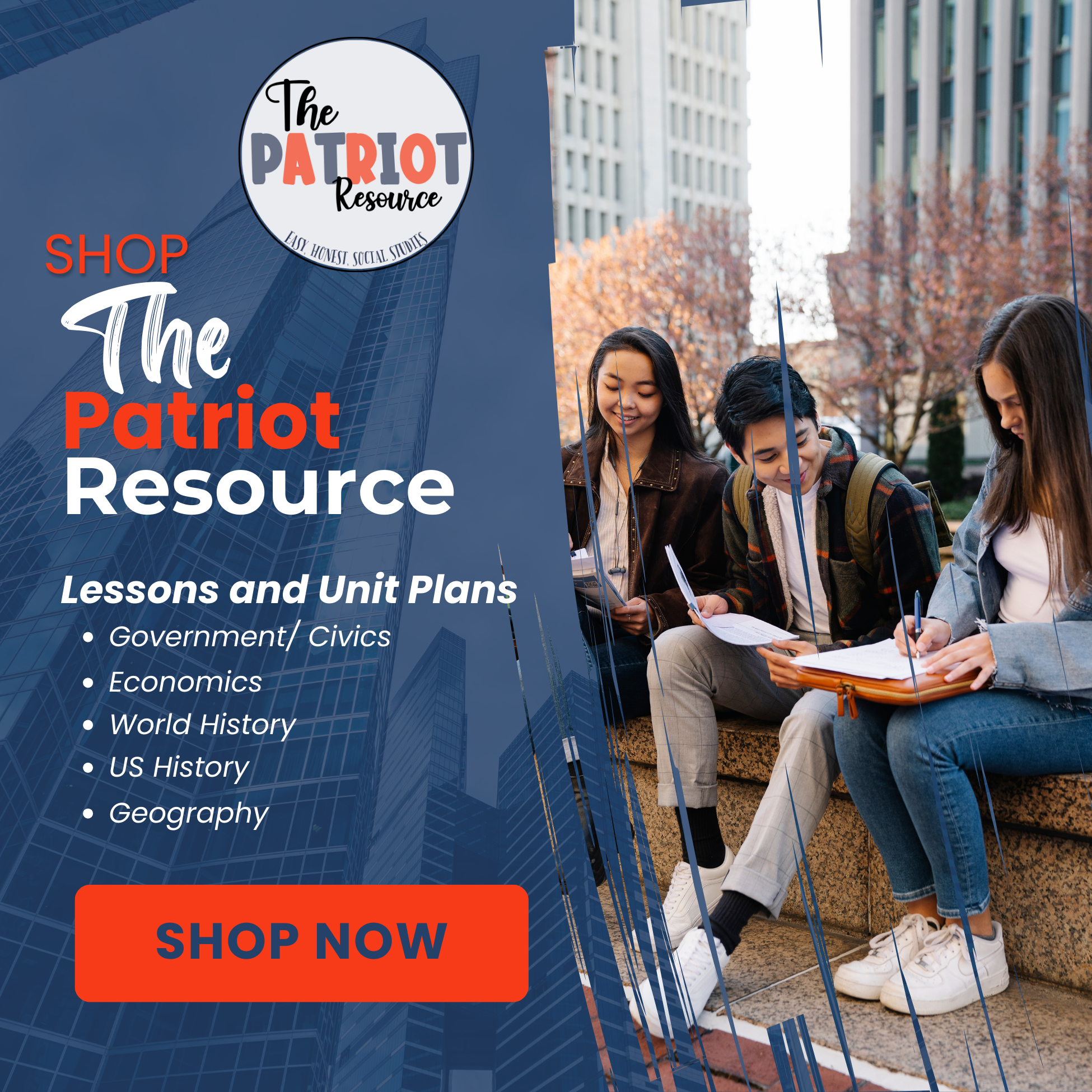 The Patriot Resource is here to help YOU! Teachers today are overwhelmed with the amount of curriculum, tests, and requirements of daily school life. The Patriot Resource is here to simplify your life and make Social Studies virtually plug and play. With our lessons and units your students will be able to explore the world of Social Studies confidently and easily. All lessons are easy to use and can be used in classrooms from late elementary school to high school. Are you a homeschooling parent? These lessons work for you as well!